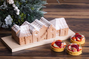 「物語に登場しそうな可愛らしいハウス型のケーキは、メープルババロワ、洋なしとレモンのマドレーヌ生地が優しい食感。切ってみるとクランベリージュレの鮮やかな赤の層が現れ、うっすら雪がふりつもっているような見た目とのコントラストがドラマチックなケーキです。