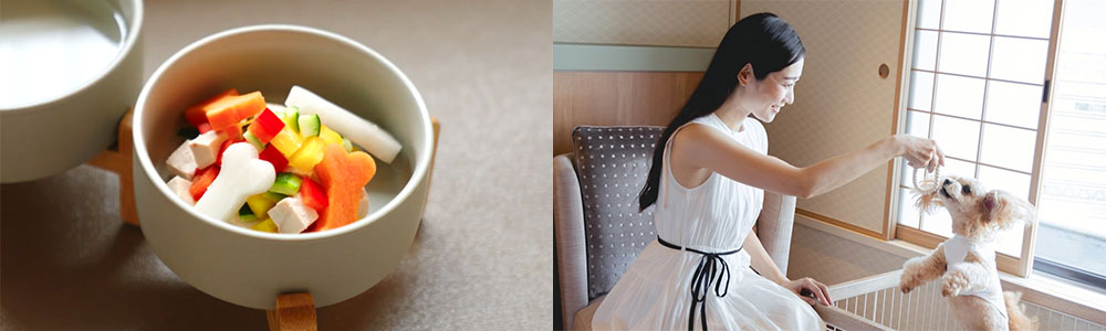 シェフが厳選した食材で作られたわんちゃん向けの美味しいお食事を客室でお楽しみいただけます。わんちゃんと一緒に寛ぎのひとときをお過ごしください。