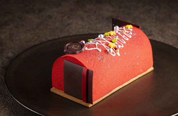 ストロベリーヨーグルトムース、アプリコットコンポートのゼリーに、濃厚なピスタチオを組み合わせたケーキ。アクセントとなるクレープ生地やビスキュイにもピスタチオを贅沢に使い、赤と緑の華やかな断面がクリスマス気分を盛り上げます。